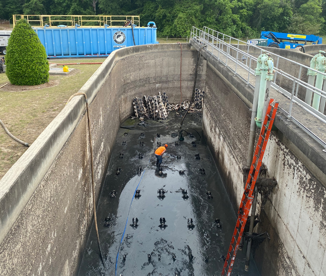 We provide complete cleaning solutions for water and wastewater treatment plants including aeration/digestor basins, sludge/sand/grit/rag removal, solids separation and processing, hauling services, lagoon dredging, clean water tank scale removal, In-Situ aeration diffuser cleaning as well as other cleaning services. We utilize both manned and robotic cleaning mechanism’s.